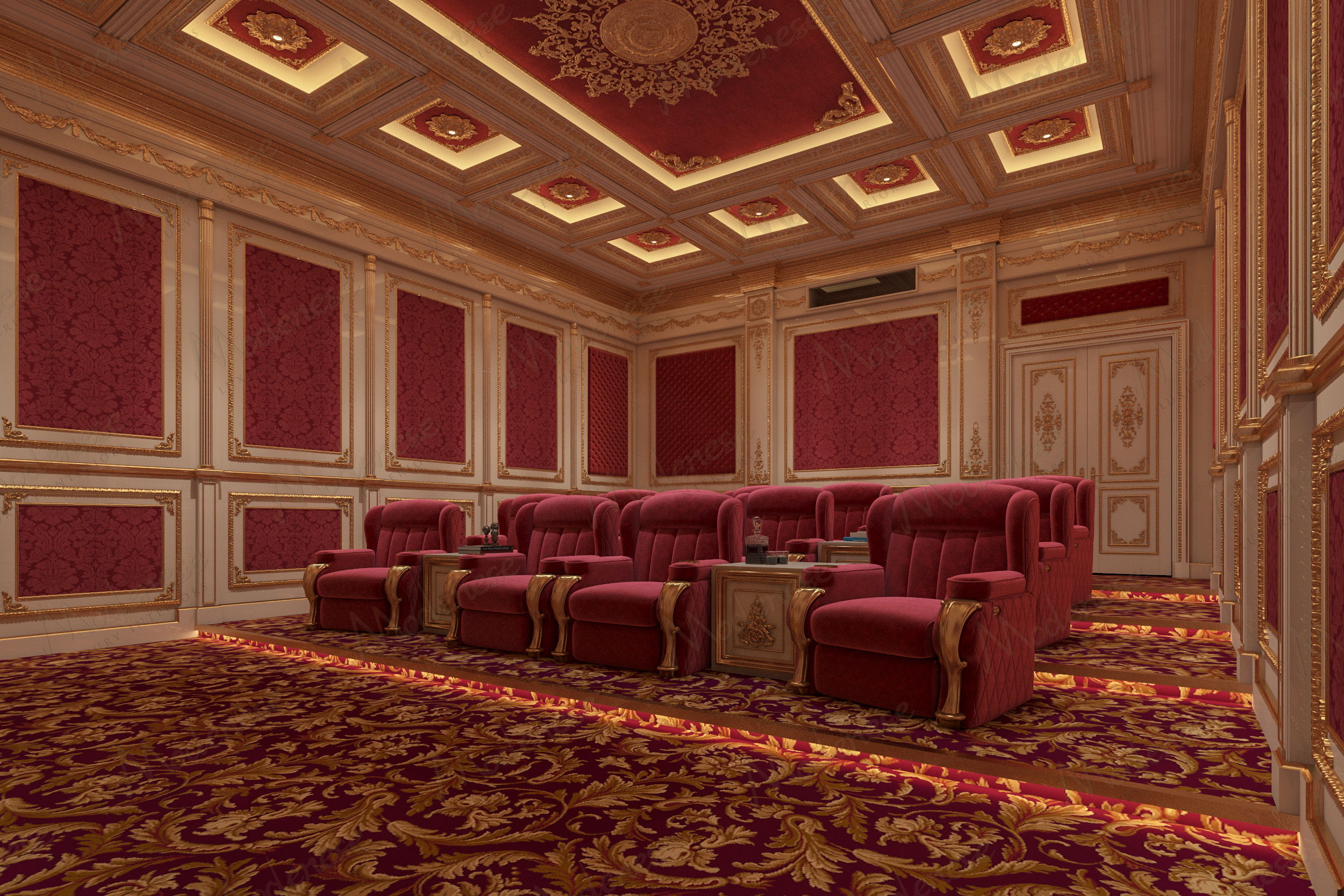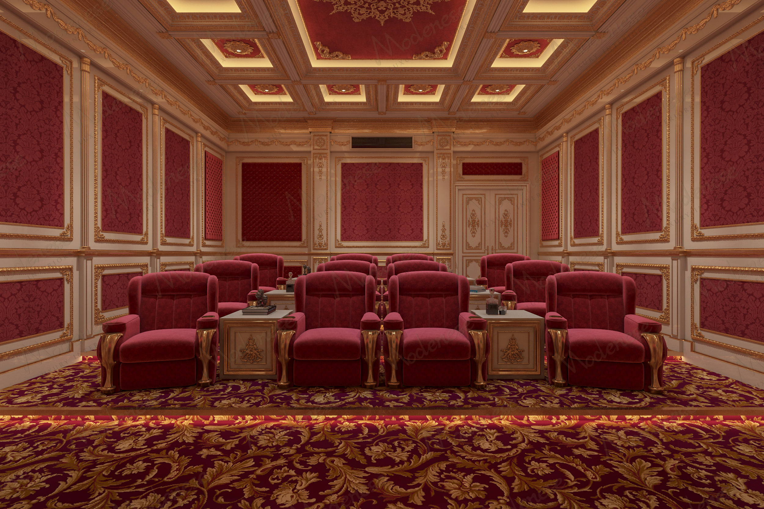 The cinematic atmosphere is enhanced by an advanced LED and lighting system by PHILIPS, seamlessly integrated into the coffered ceiling. The lighting design accentuates the architectural depth, ornamental details, and rich textures, while creating ideal conditions for immersive viewing. This bespoke home cinema in Riyadh perfectly embodies Modenese Luxury Interiors’ philosophy: a harmonious fusion of Italian craftsmanship, tailored design, and state-of-the-art technology, designed to deliver an exclusive, deeply personalized entertainment experience.
